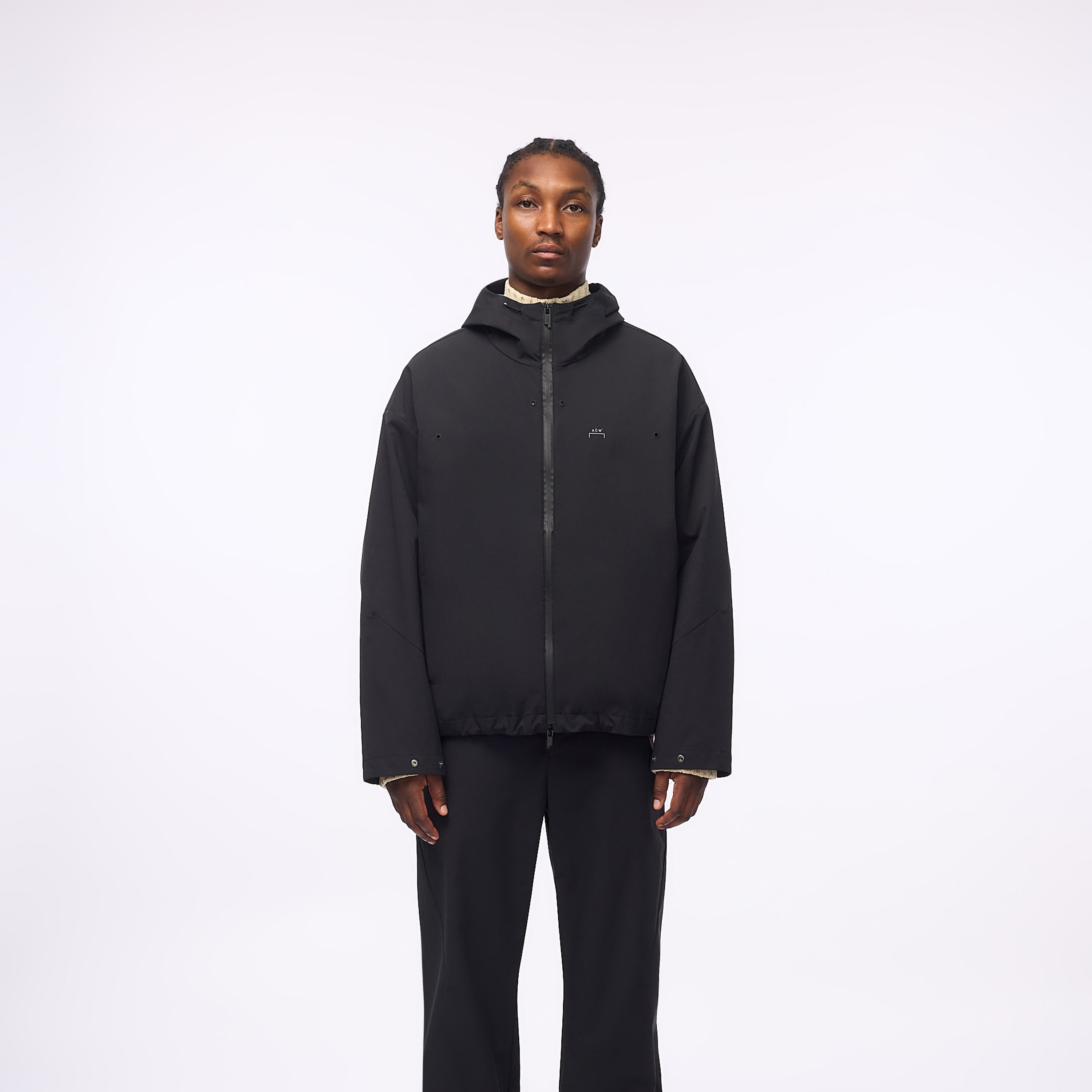 Two-way water-resistant CF front zip with custom ACW* metal puller and internal zip guard.