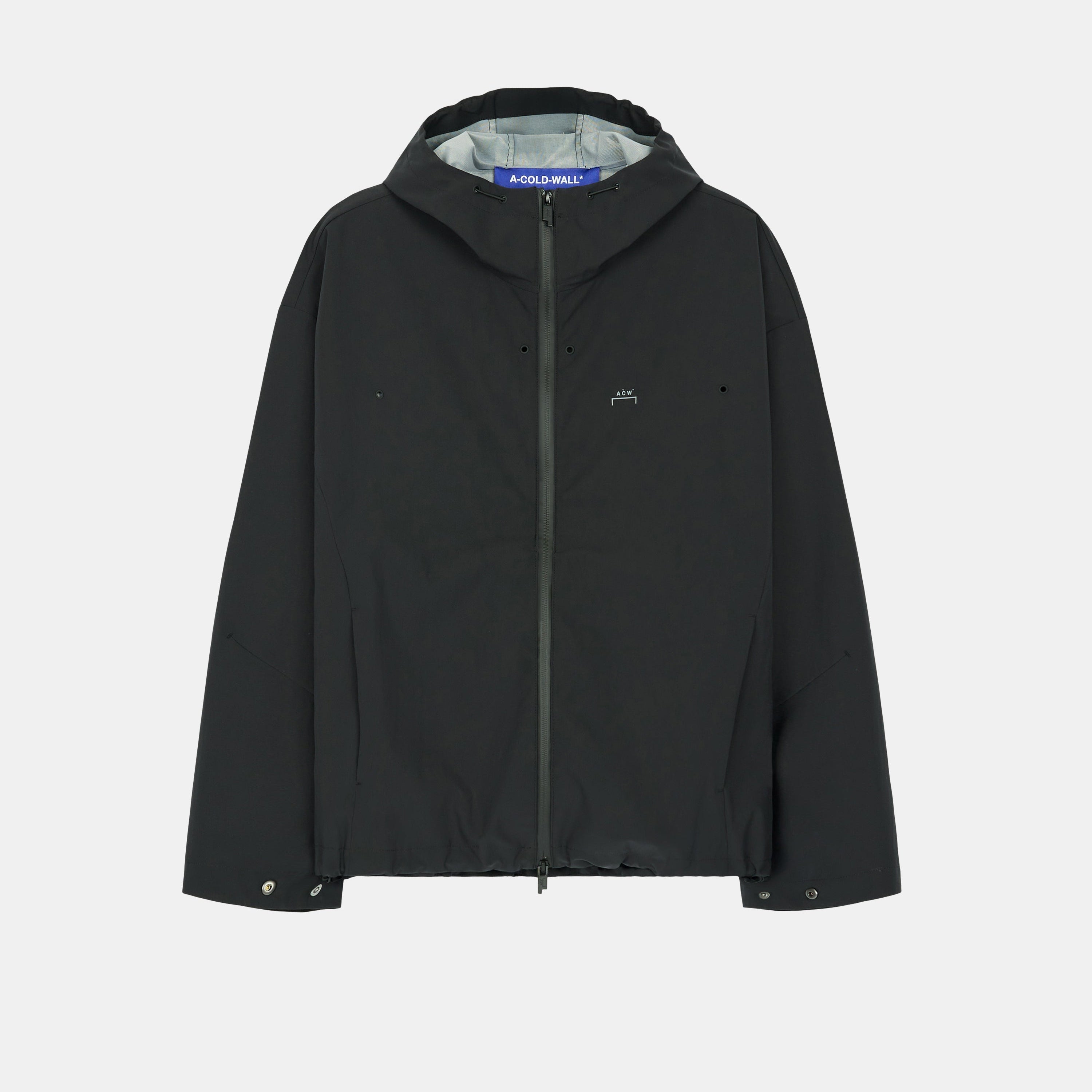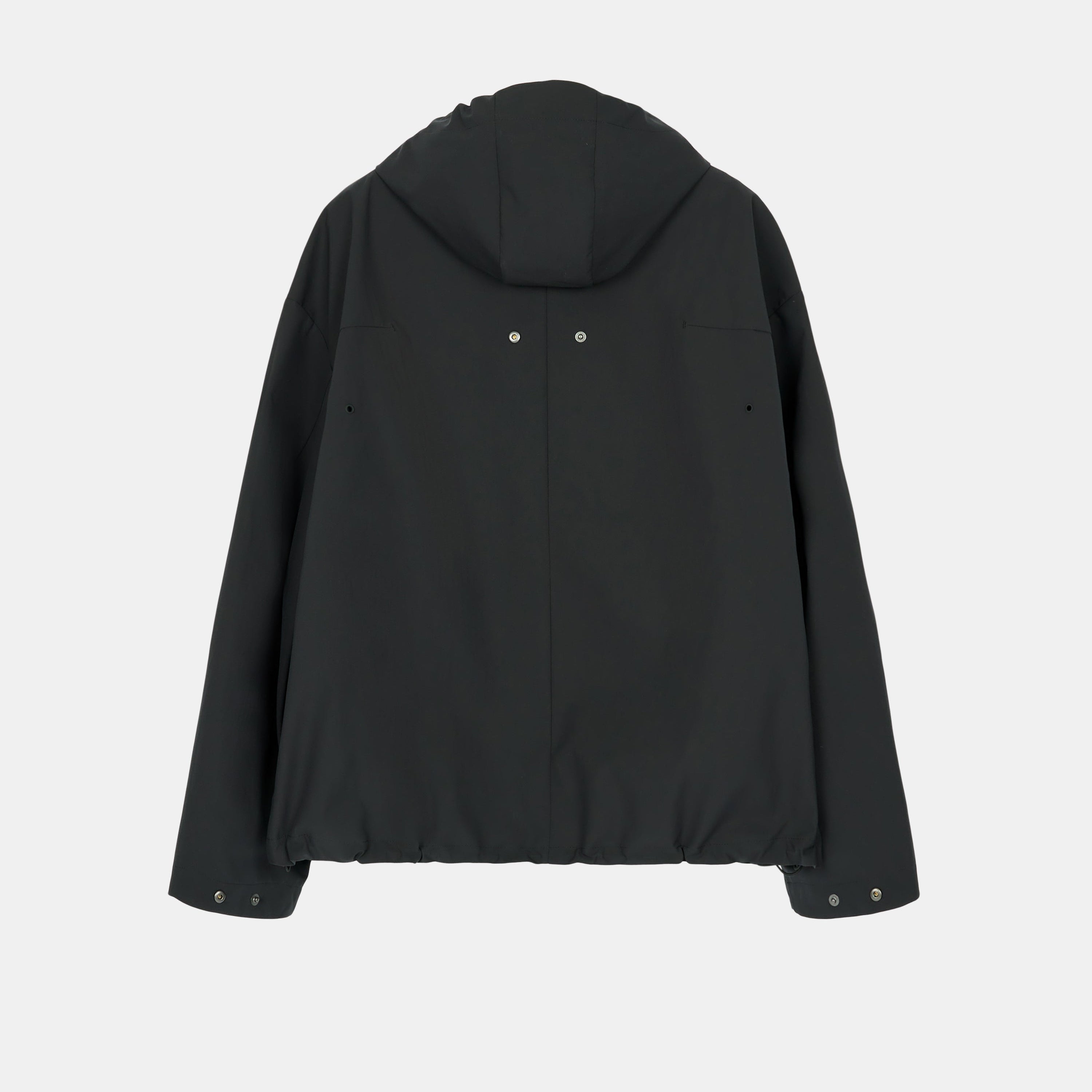 Relaxed-fit, water-resistant jacket with reinforced 3L backing and  a three-panel hood. Drawcord and snap adjustments allow wearer to alter the shape of the garment.