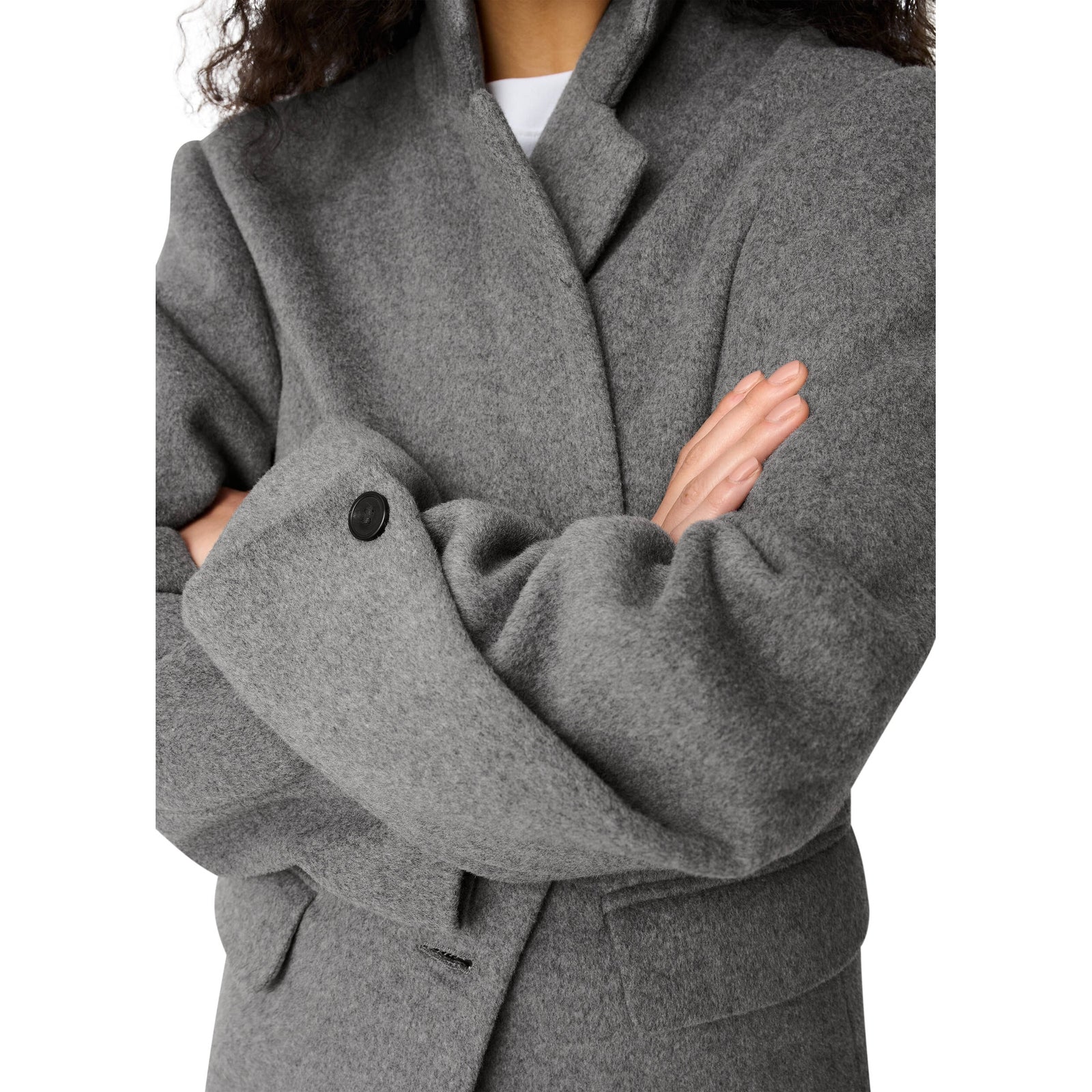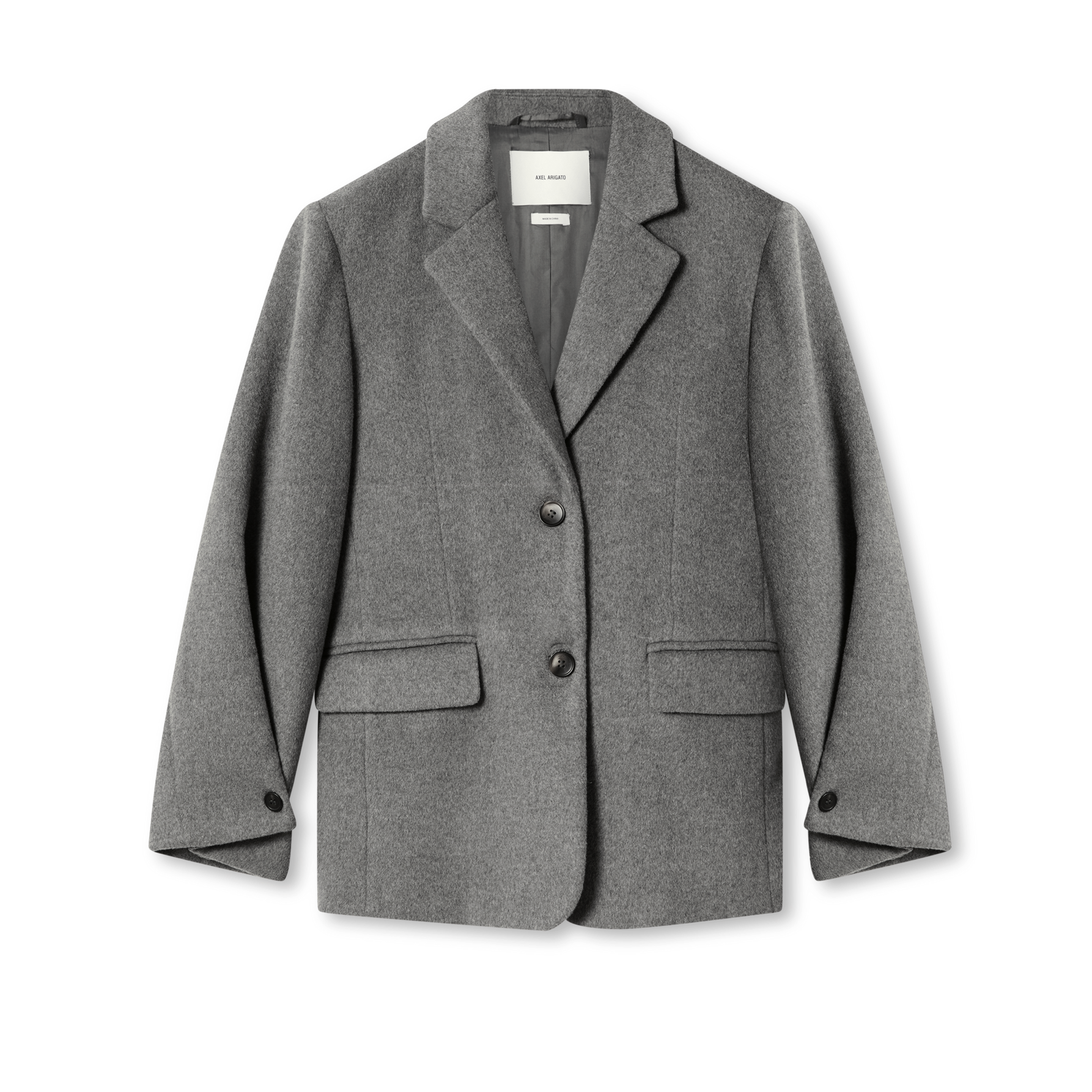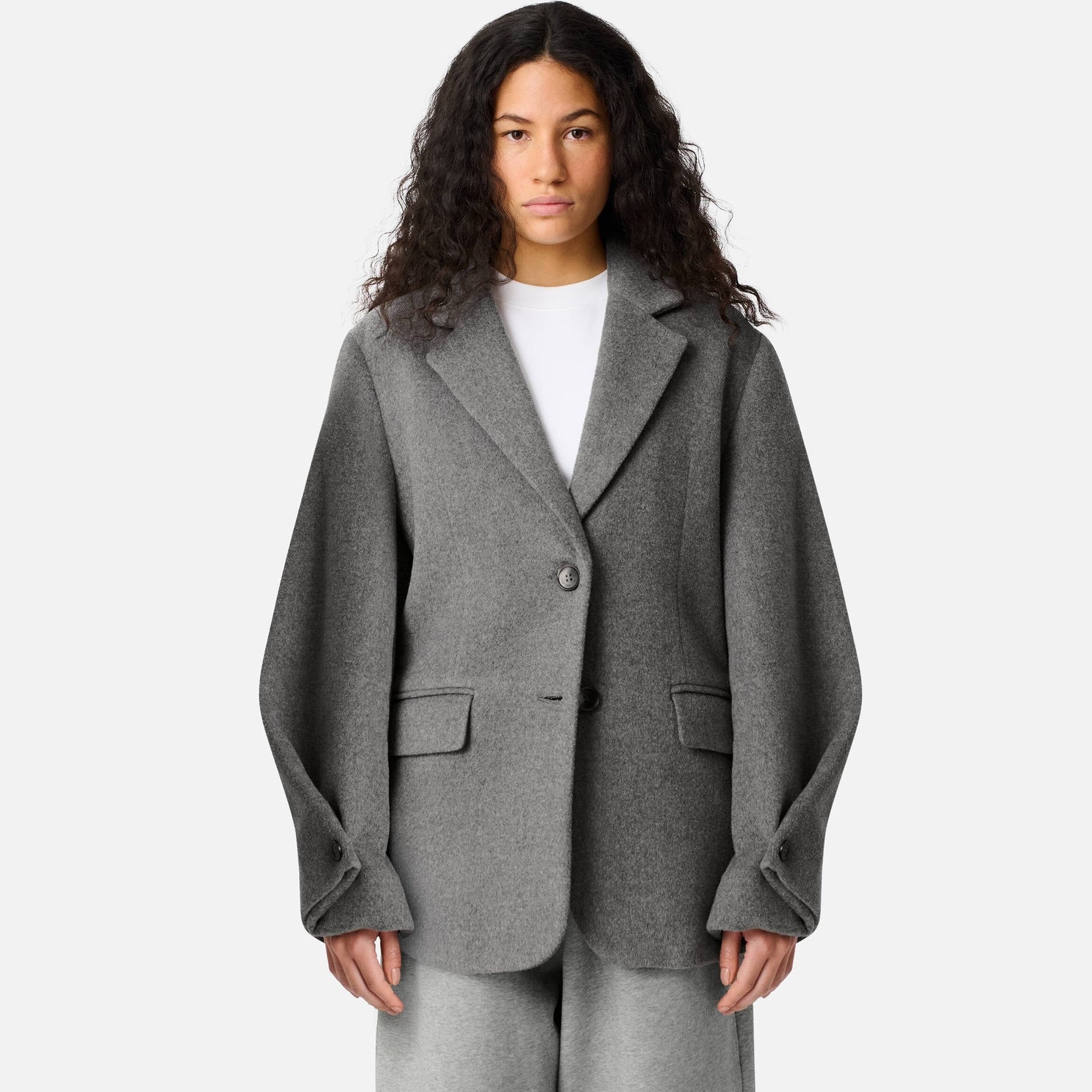 The Arlo blazer is crafted with wool for a soft, warm finish. Asymmetric pleats at the cuffs enhance the relaxed, oversized silhouette.