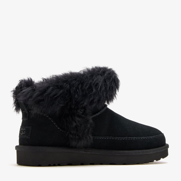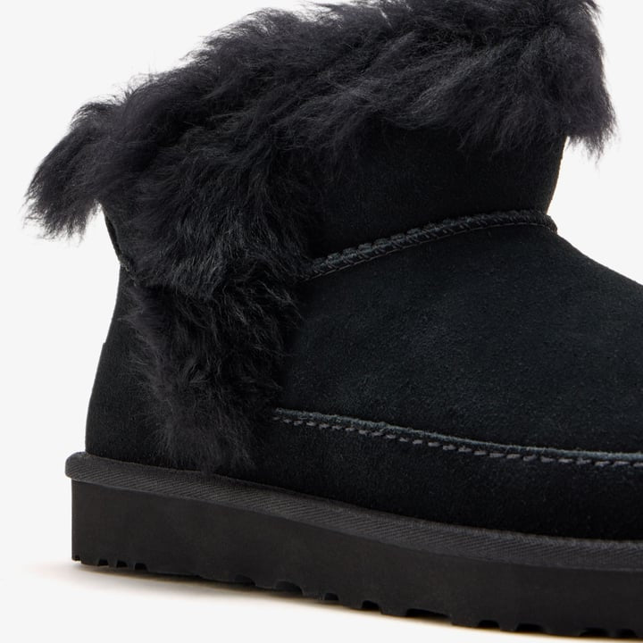 Our Classic Ultra Mini is one our most coveted Classics, and we've made it even more cozy with our Classic Ultra Mini Chalet. Featuring the same lower shaft you love about the original, this one is trimmed in fluffy sheepskin for a full mountain town "moment." It's crafted with rich suede set atop a lightweight sugarcane EVA outsole, and inside you'll be wrapped up in the warmth of our soft UGGplush™ lining from upcycled wool.