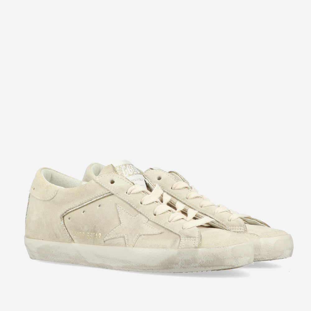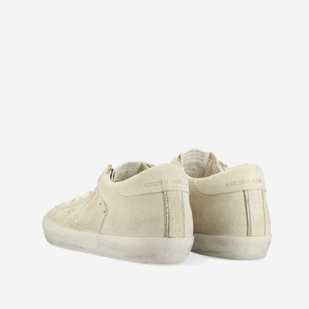 Beige suede sneakers from Golden Goose named, Super Star - GWF00103 F007560 15110 - eggnog. Finished with glitter details. Sole height of 3 cm. Item fits true to size.