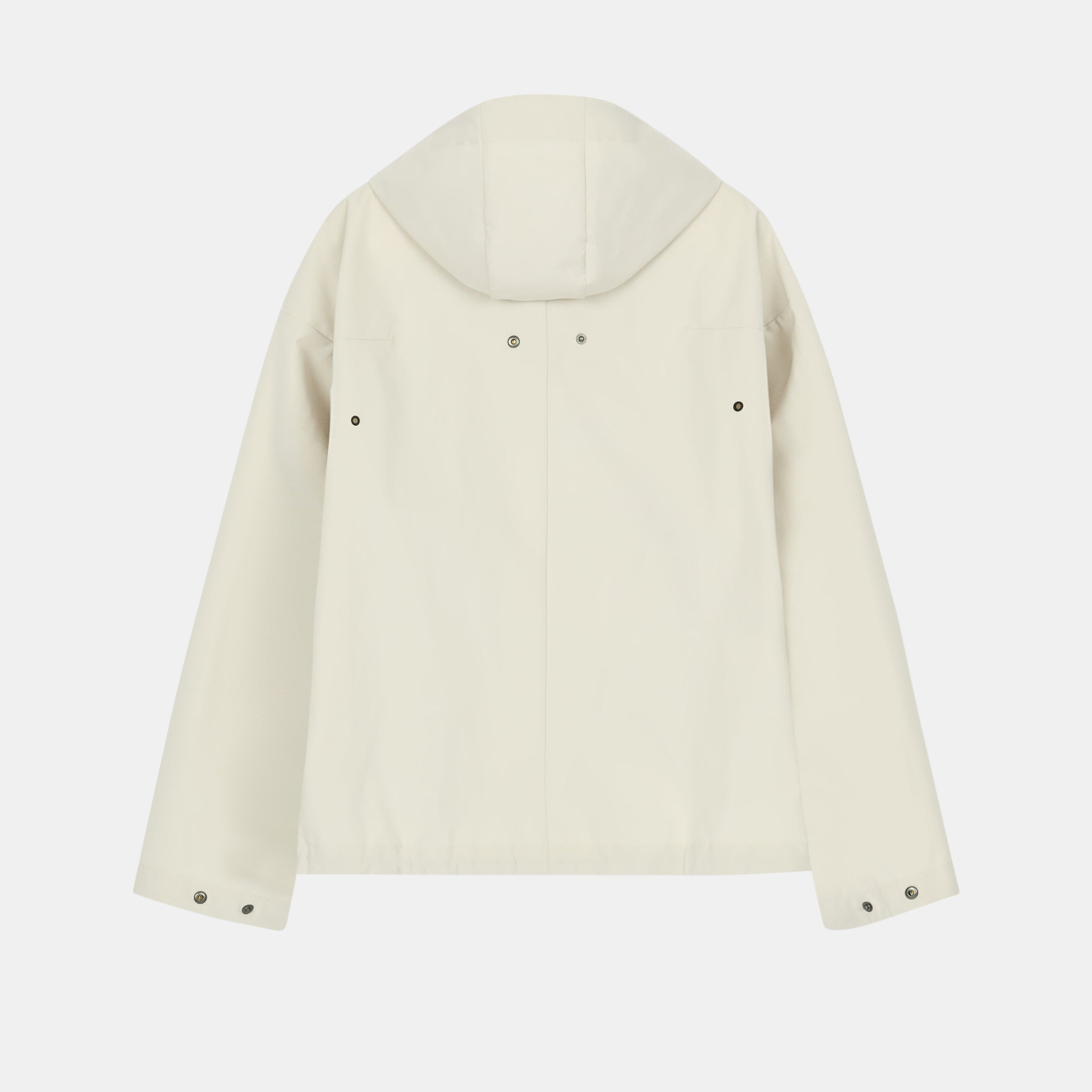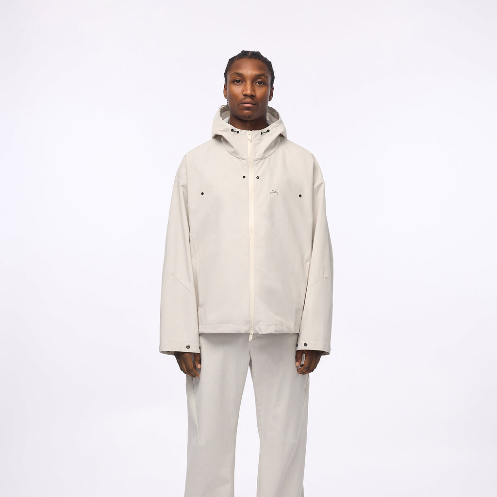 Relaxed-fit, water-resistant jacket with reinforced 3L backing and  a three-panel hood. Drawcord and snap adjustments allow wearer to alter the shape of the garment.
