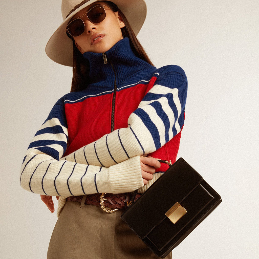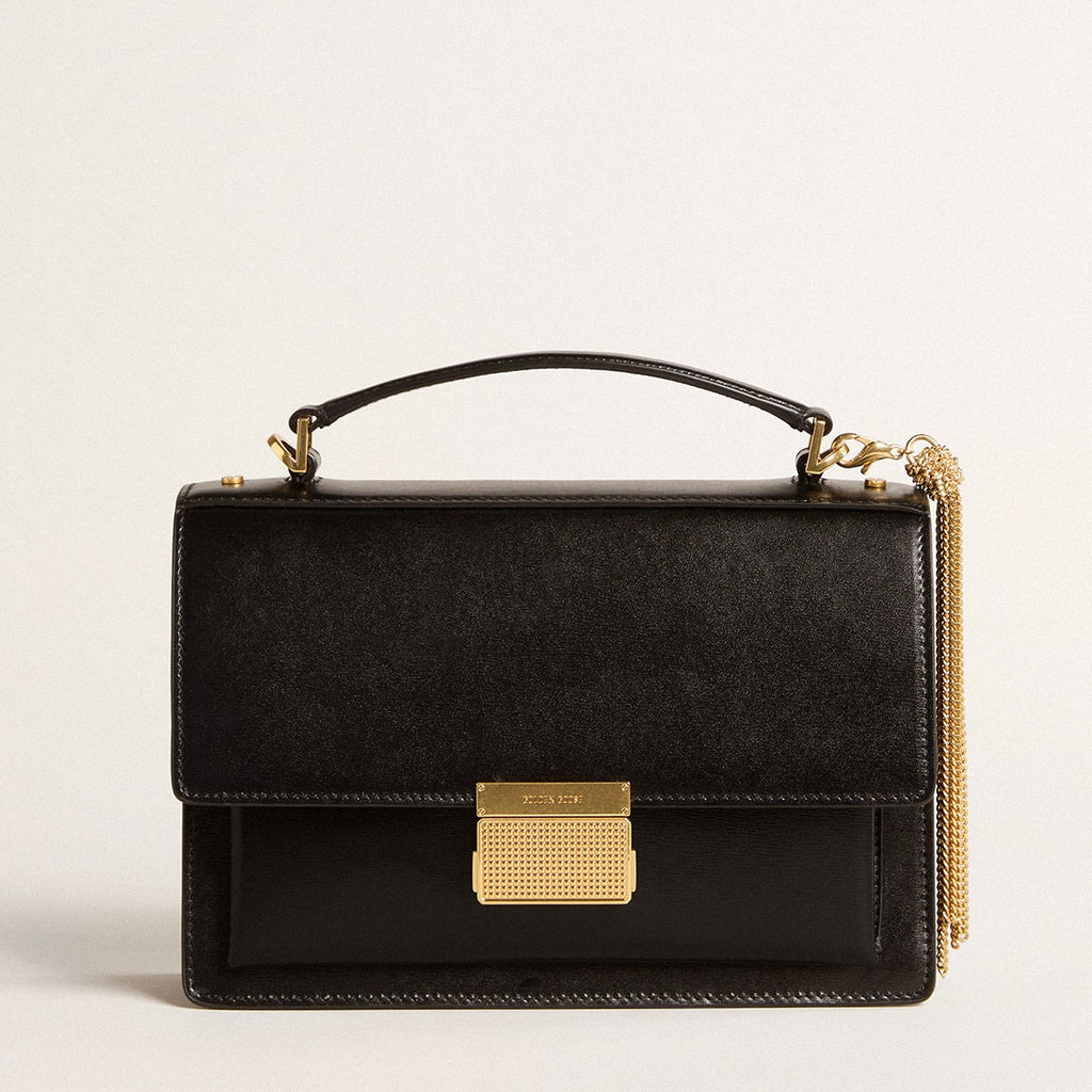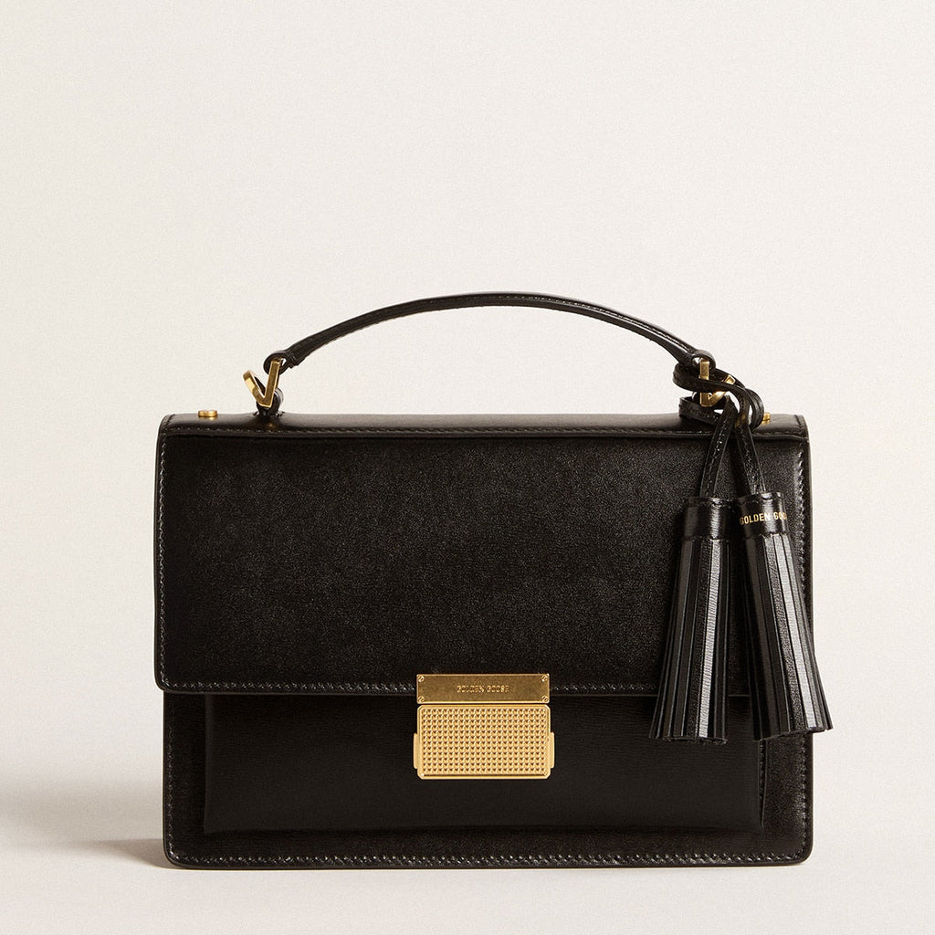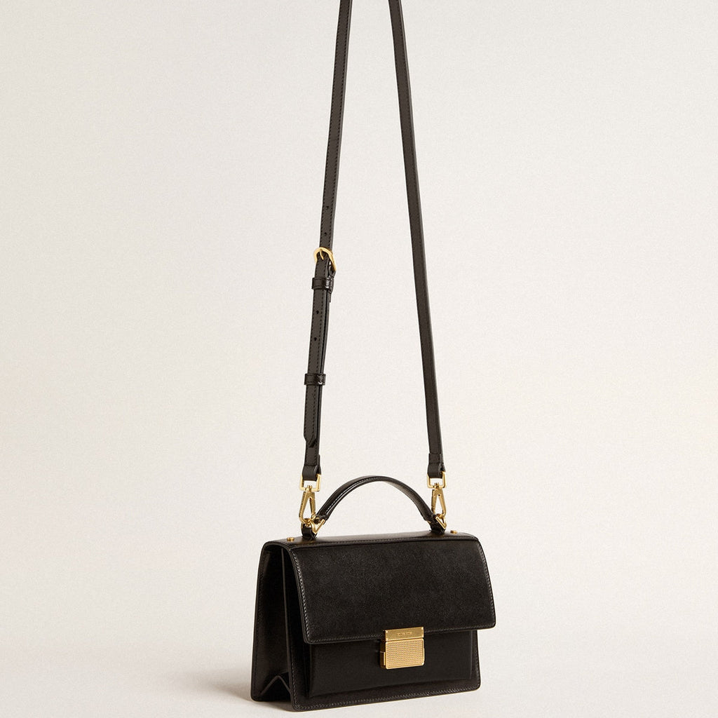 Functional yet sophisticated, our Venezia bag is a statement of Venetian elegance, inviting you to carry a piece of its soul wherever you go. In black boarded leather, this model features a gold-tone buckle closure and gold-colored metal detailing. The double inside pocket adds the finishing touch.