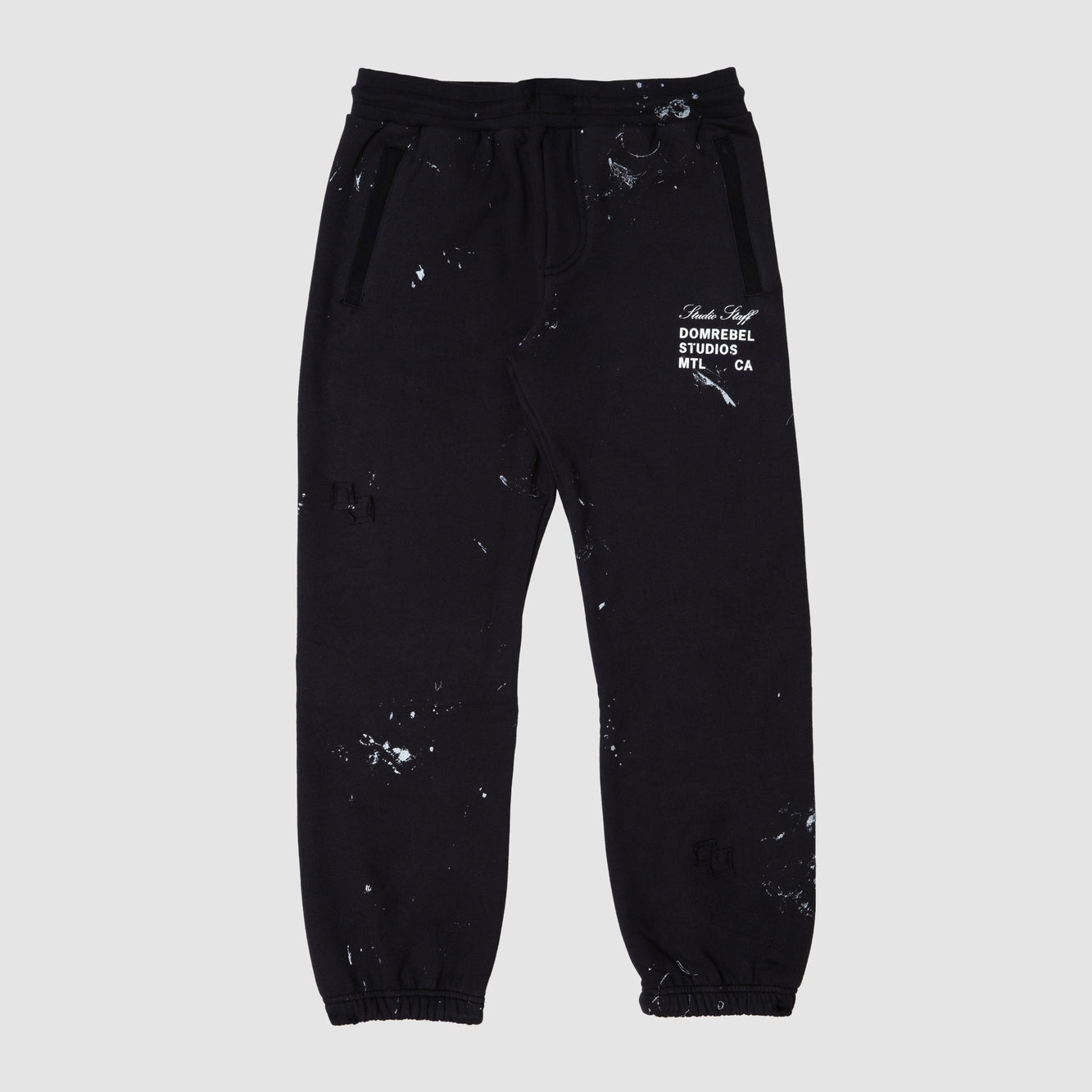 The Staff sweatpants are made from custom cotton loop-back french terry, milled and constructed in Canada. Studio paints stains are printed throughout, with DOMREBEL logo printed on thigh. Featuring side zip pockets with grosgrain trim, faux fly construction at front, and a straight leg opening with concealed drawstring. Fit is regular and true to size.