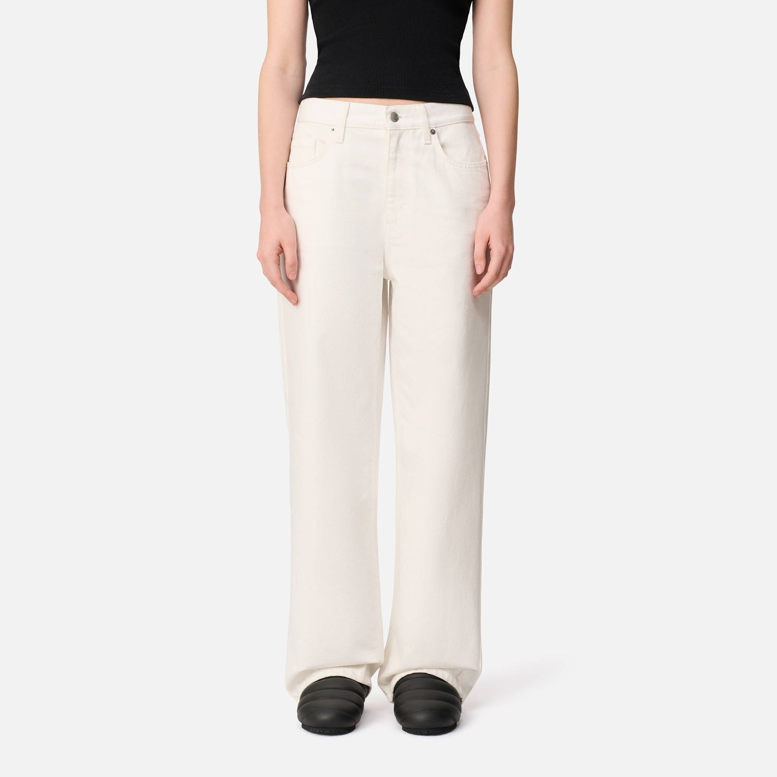 The Lidia Straight Jeans are crafted in Italy from 100% cotton denim with a straight-leg cut and classic five-pocket design. Details include a hand-embroidered 'Arigato' on the back pocket and a yellow branded patch at the waistband, finished with metal buttons and rivets. Each pair is washed for a distinct look, making every garment one of a kind.