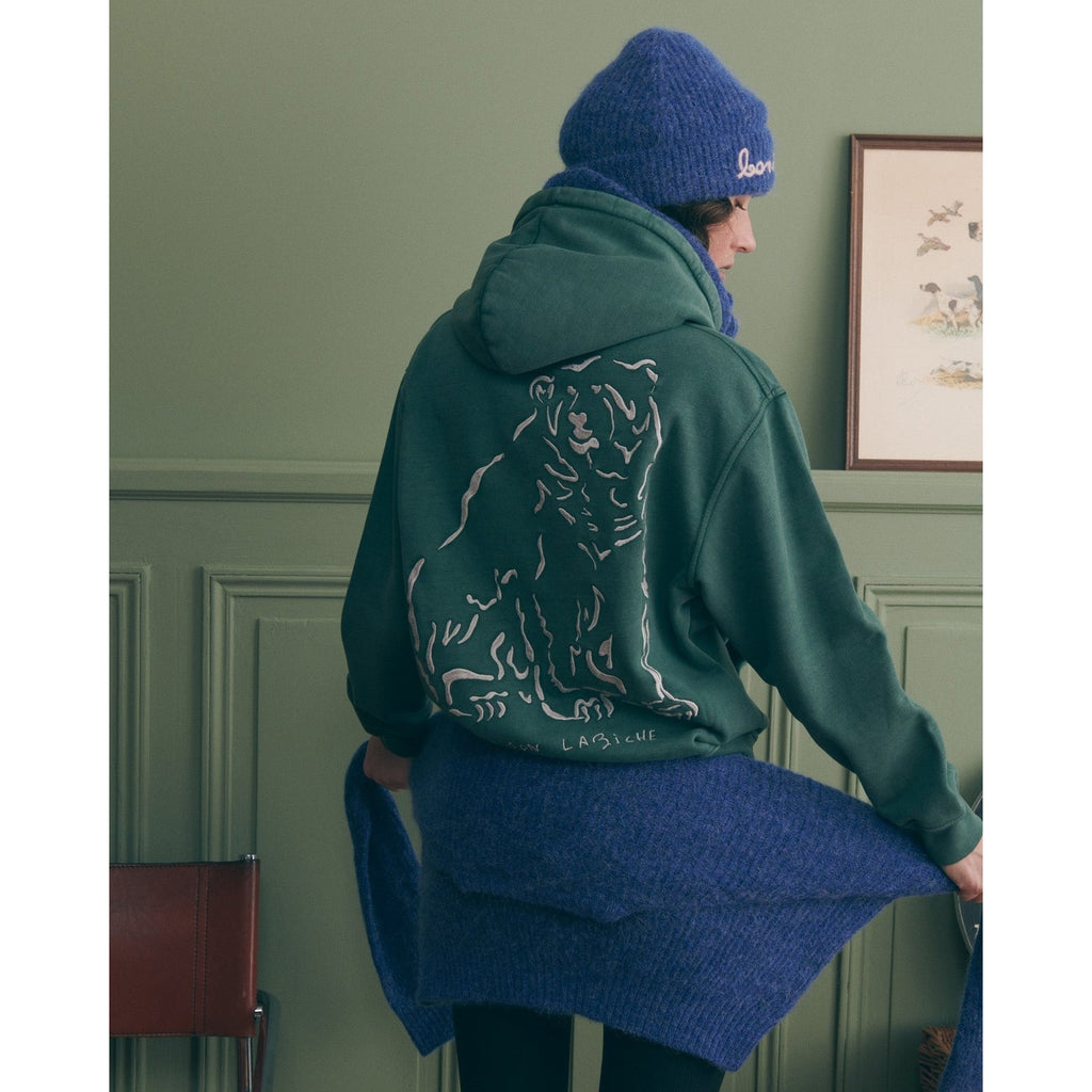 Our iconic Reaumur women's hoodie has a comfortable, oversized cut with a front kangaroo pocket. It has dropped armholes and a ribbed finish at the bottom of the sleeves and body. Made in soft Maison Labiche fleece. Its embroidery illustrates one of Labiche's pet themes: beasts, animals and critters.