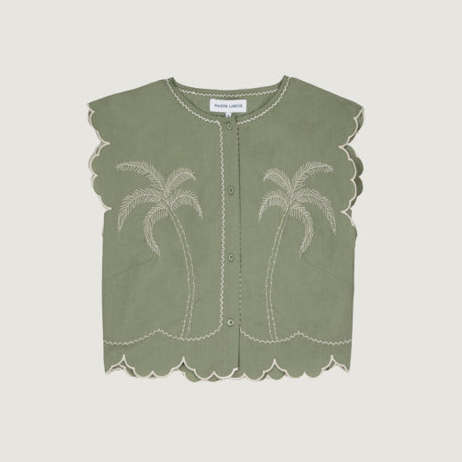 Our Bessin shirt is fitted, with short scalloped sleeves and delicate embroidery on the chest.