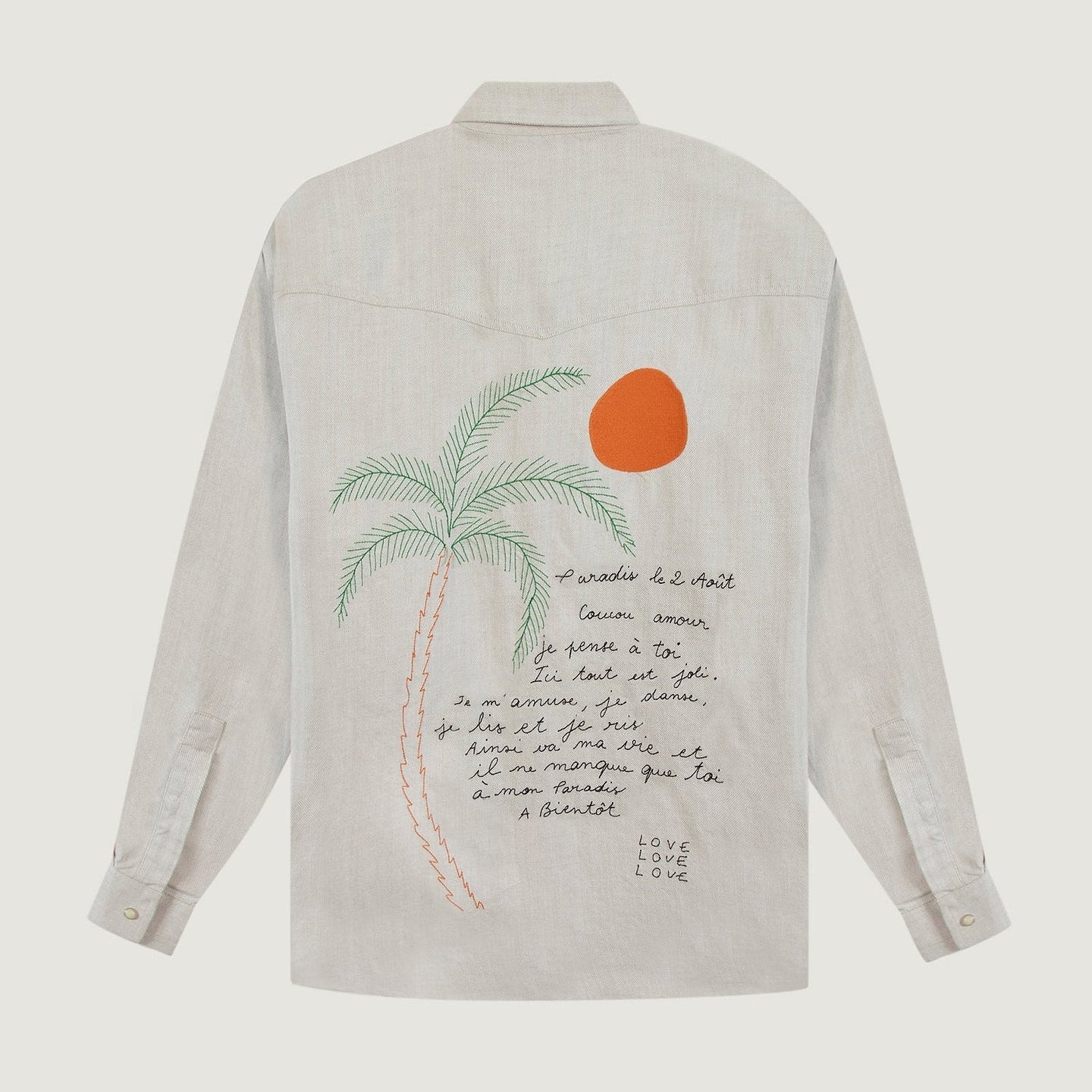 Our Monselet oversized shirt has a wide cut, a shirttail hem, patch pockets on the chest and mother-of-pearl snap buttons. her embroidery represents a gentle correspondence.