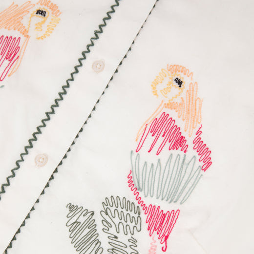 Our Bessin shirt is fitted, with short scalloped sleeves and delicate embroidery on the chest.