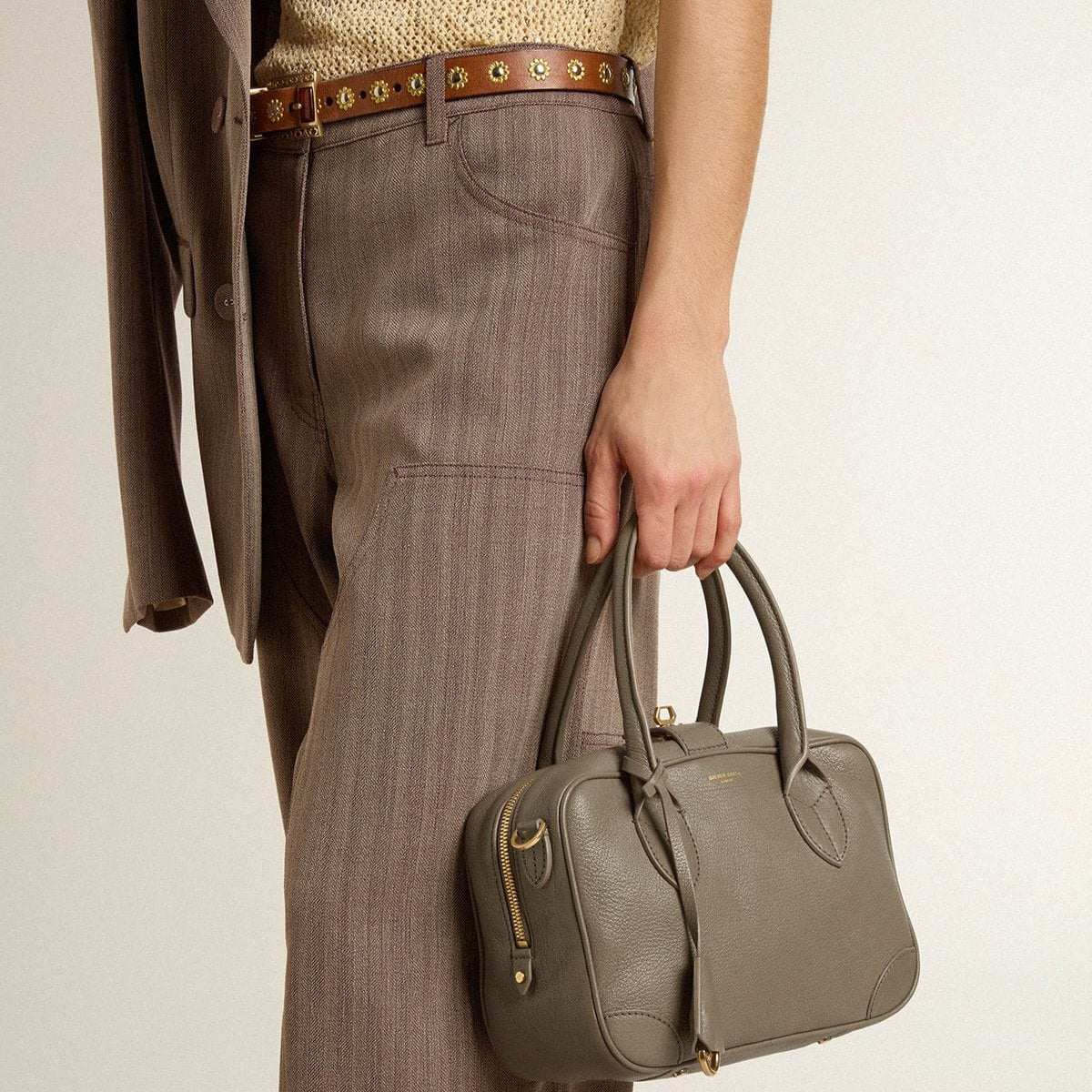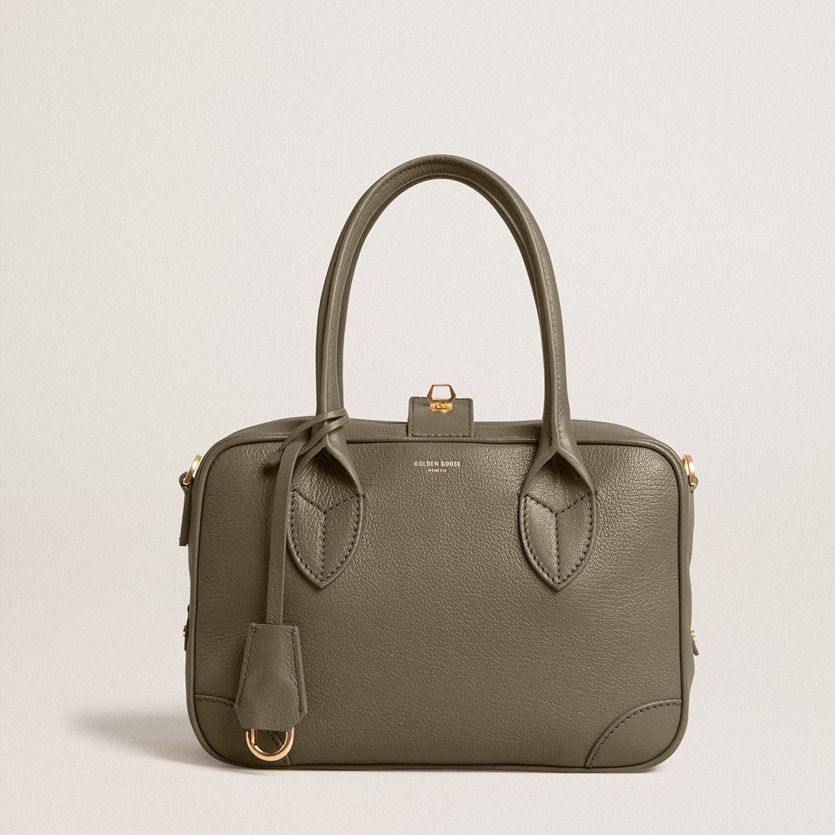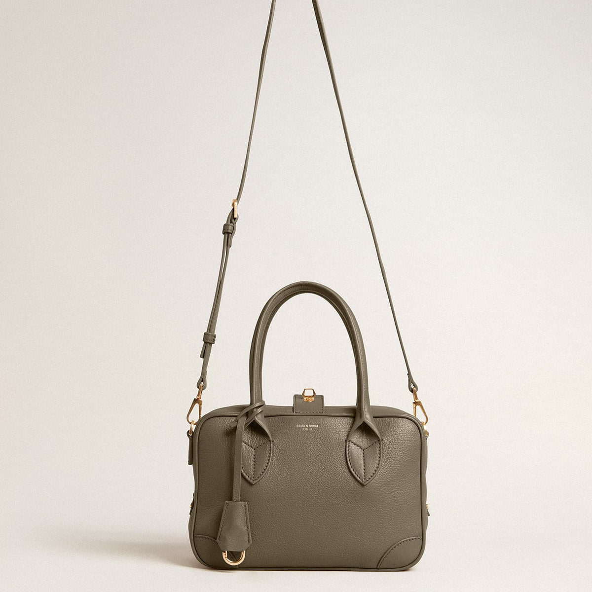 Our Vita Bag is a tribute the triumphant epoch of La Dolce Vita and its aesthetic codes, speaking to the wanderlust of the refined traveler. In sage-green sheepskin leather, this model features a double closure: a double-pull zip and a golden key. The gold logo printed on the front and the snap hook enclosed in a leather case on the outside add the finishing touch.