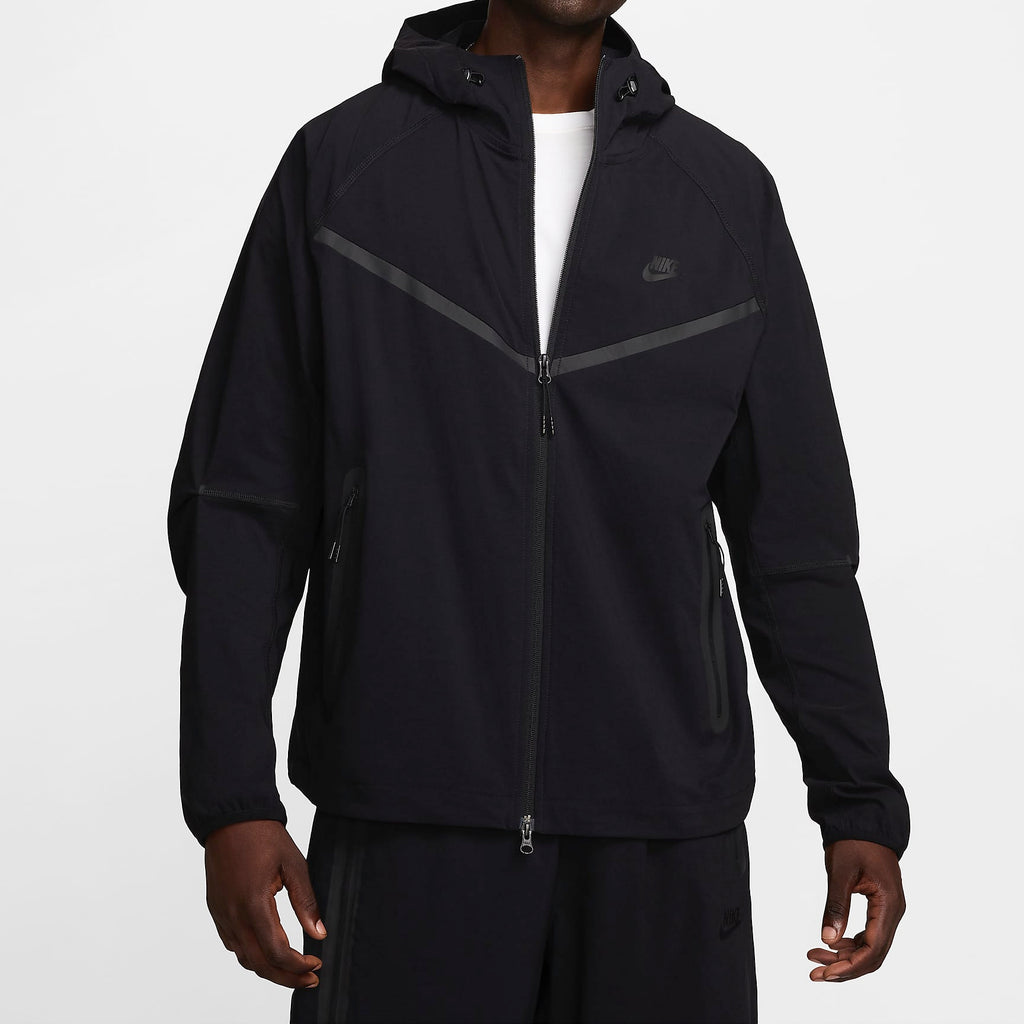 Crafted with stretchy, breathable material, the Nike Tech Woven Jacket offers you ease of movement and adjustable details. Bungee cords with cord locks create a custom fit at the hem and hood.